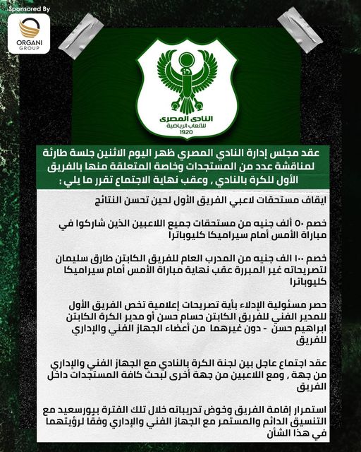 2- خصم 50 ألف جنيه من مستحقات جميع اللاعبين الذين شاركوا في مباراة الأمس أمام سيراميكا كليوباترا.