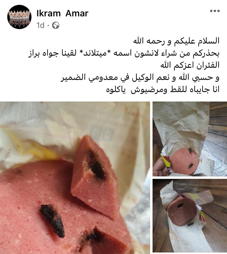 وقال صاحب الواقعة " السلام عليكم و رحمه الله بحذركم من شراء لانشون اسمه *ميتلاند* لقينا جواه براز الفئران اعزكم الله و حسبي الله و نعم الوكيل في معدومي الضميرانا جايباه للقط ومرضيوش ياكلوه".