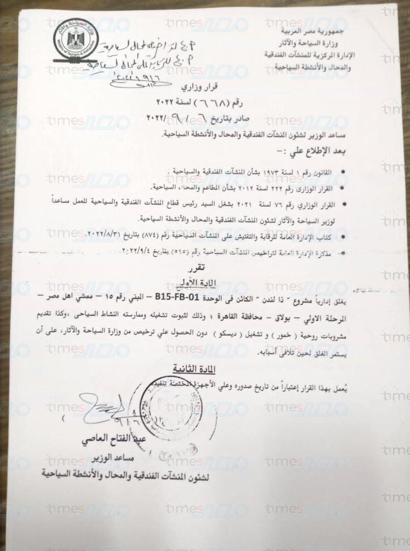 أصدرت وزارة السياحة قرارا وزارياً، بشأن أحد المنشأت السياحية الشهيرة الغير مرخصة الكائنة بممشى أهل مصر محافظة القاهرة .