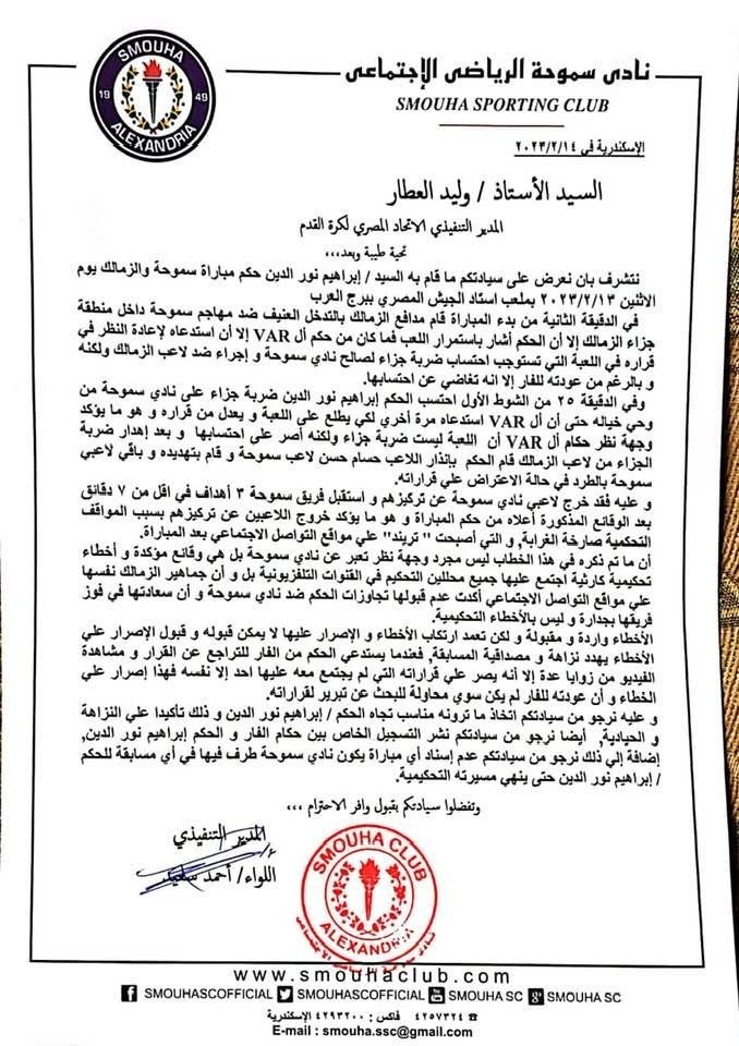 أن ما تم ذكره في هذا الخطاب ليس مجرد وجهة نظر تعبر عن نادي سموحة بل هي وقائع مؤكدة و أخطاء تحكيمية كارثية اجتمع عليها جميع محللين التحكيم في القنوات التلفزيونية بل و أن جماهير الزمالك نفسها علي مواقع التواصل الاجتماعي أكدت عدم قبولها تجاوزات الحكم ضد نادي سموحة و أن سعادتها في فوز فريقها بجدارة و ليس بالأخطاء التحكيمية. الأخطاء واردة ومقبولة و لكن تعمد ارتكاب الأخطاء و الإصرار عليها لا يمكن قبوله و قبول الإصرار علي الأخطاء يهدد نزاهة ومصداقية المسابقة, فعندما يستدعي الحكم من الفار للتراجع عن القرار و مشاهدة الفيديو من زوايا عدة إلا أنه يصر علي قراراته التي لم يجتمع معه عليها احد إلا نفسه فهذا إصرار علي الخطاء و أن عودته للفار لم يكن سوي محاولة للبحث عن تبرير لقراراته.