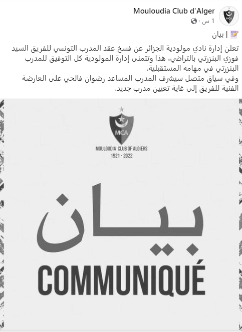تعلن إدارة نادي مولودية الجزائر عن فسخ عقد المدرب التونسي للفريق السيد فوزي البنزرتي بالتراضي، هذا وتتمنى إدارة المولودية كل التوفيق للمدرب البنزرتي في مهامه المستقبلية.