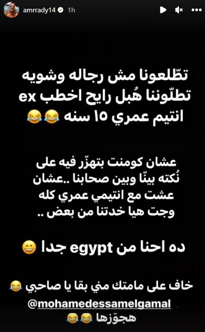 وأضاف عمرو راضي:" ده احنا من Egypt جدا خاف على مامتك مني بقا يا صاحبي".