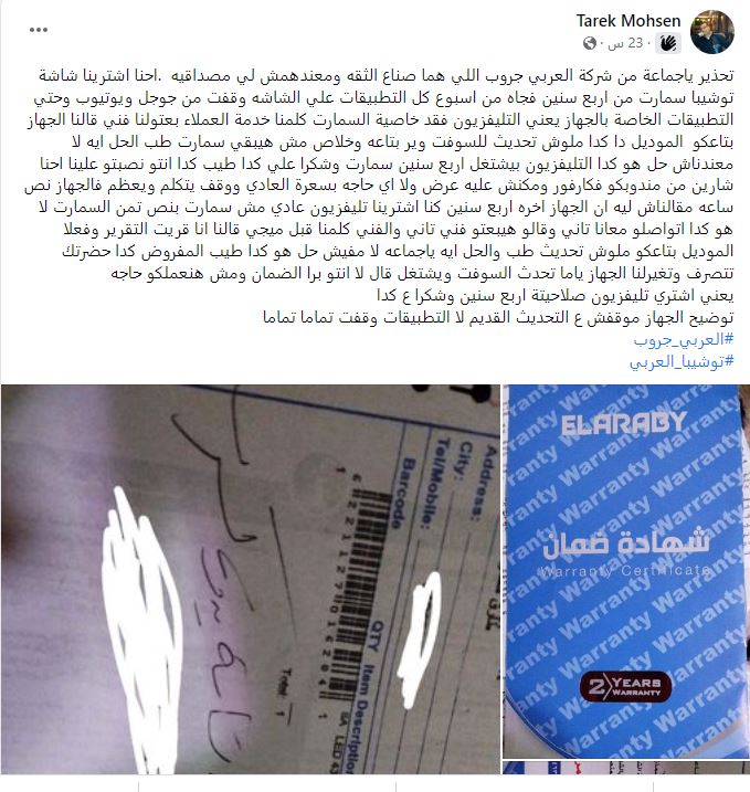 وقال صاحب المشكلة " تحذير ياجماعة من شركة العربي جروب اللي هما صناع الثقه ومعندهمش لي مصداقيه .احنا اشترينا شاشة توشيبا سمارت من اربع سنين فجاه من اسبوع كل التطبيقات علي الشاشه وقفت من جوجل ويوتيوب وحتي التطبيقات الخاصة بالجهاز يعني التليفزيون فقد خاصية السمارت كلمنا خدمة العملاء بعتولنا فني قالنا الجهاز بتاعكو الموديل دا كدا ملوش تحديث للسوفت وير بتاعه وخلاص مش هيبقي سمارت طب الحل ايه لا معندناش حل هو كدا التليفزيون بيشتغل اربع سنين سمارت وشكرا علي كدا طيب كدا انتو نصبتو علينا احنا شارين من مندوبكو فكارفور ومكنش عليه عرض ولا اي حاجه بسعرة العادي ووقف يتكلم ويعظم فالجهاز نص ساعه مقالناش ليه ان الجهاز اخره اربع سنين كنا اشترينا تليفزيون عادي مش سمارت بنص تمن السمارت"