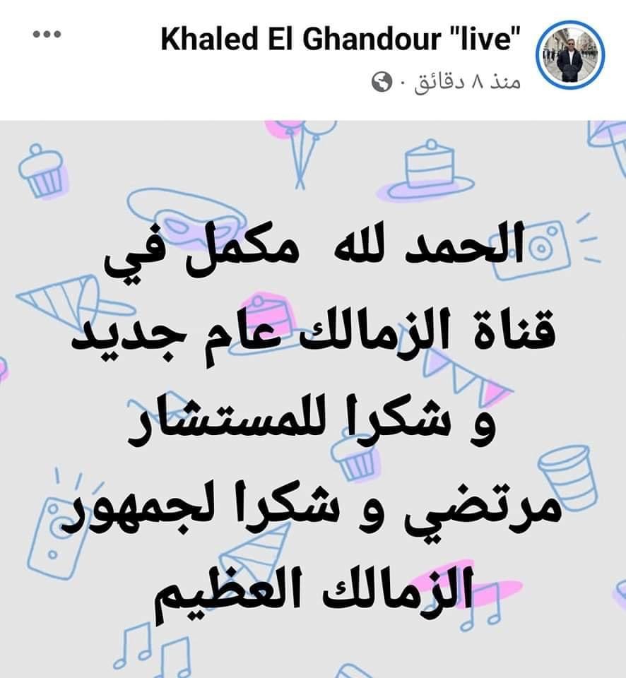 وكتب خالد الغندور، عبر صفحته الرسمية على موقع التواصل الاجتماعي "فيس بوك": "الحمد لله مكمل في قناة الزمالك عام جديد وشكرا للمستشار مرتضي وشكرا لجمهور الزمالك العظيم".