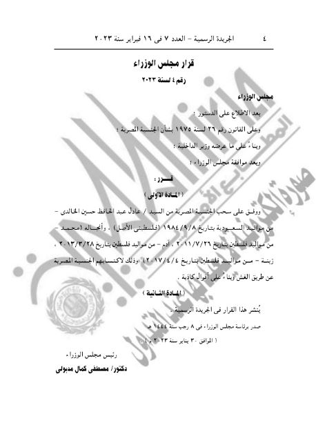 ونشرت الجريدة الرسمية القرار الذى تضمن سحب الجنسية المصرية من سميرة عبد الحافظ حسين الخالدي مواليد 1963، وعادل عبد الحافظ حسين الخالدي مواليد السعودية 1984 وانجاله محمد من مواليد فلسطين 2011، وآدم مواليد فلسطين عام 2013، وزينه من مواليد فلسطين 2017، وبسام عبد الحافظ حسين الخالدي من مواليد فلسطين 1967، وأنجاله عبد الحافظ مواليد السعودية عام 1992، وصهيب من مواليد فلسطين عام 1999، ومحمد من مواليد فلسطين عام 1997، وليال من فلسطين عام 2002 وشمس من مواليد فلسطين عام 2006 ورؤى من مواليد فلسطين عام 2012 وذلك اكتسابهم الجنسية المصرية عن طريق الغش وبناء على أقوال كاذبة.