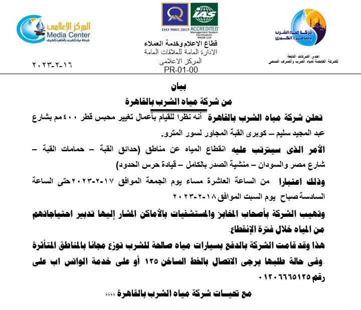 وأوضحت شركة مياه الشرب بالقاهرة أن الانقطاع يبدأ اعتبارا من الساعة العاشرة مساء يوم الجمعة الموافق 17-2-2023 حتى الساعة السادسة صباح يوم السبت الموافق 18-2-2023
