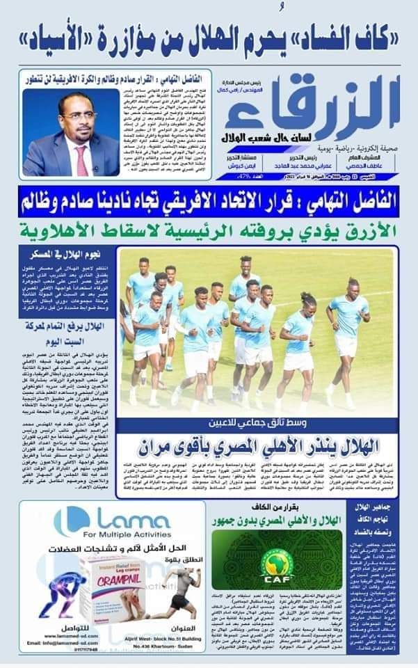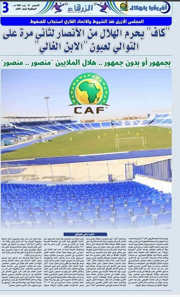 ووصفت صحيفة الزرقاء قرار الكاف بالفساد، وعنونت "كاف" يحرم الهلال من الأنصار لثاني مرة علي التوالي لعيون الابن الغالي (في إشارة إلى النادي الأهلي)"، بالأضافة إلى "كاف الفساد" يحرم الهلال من "مؤازرة الأسياد".