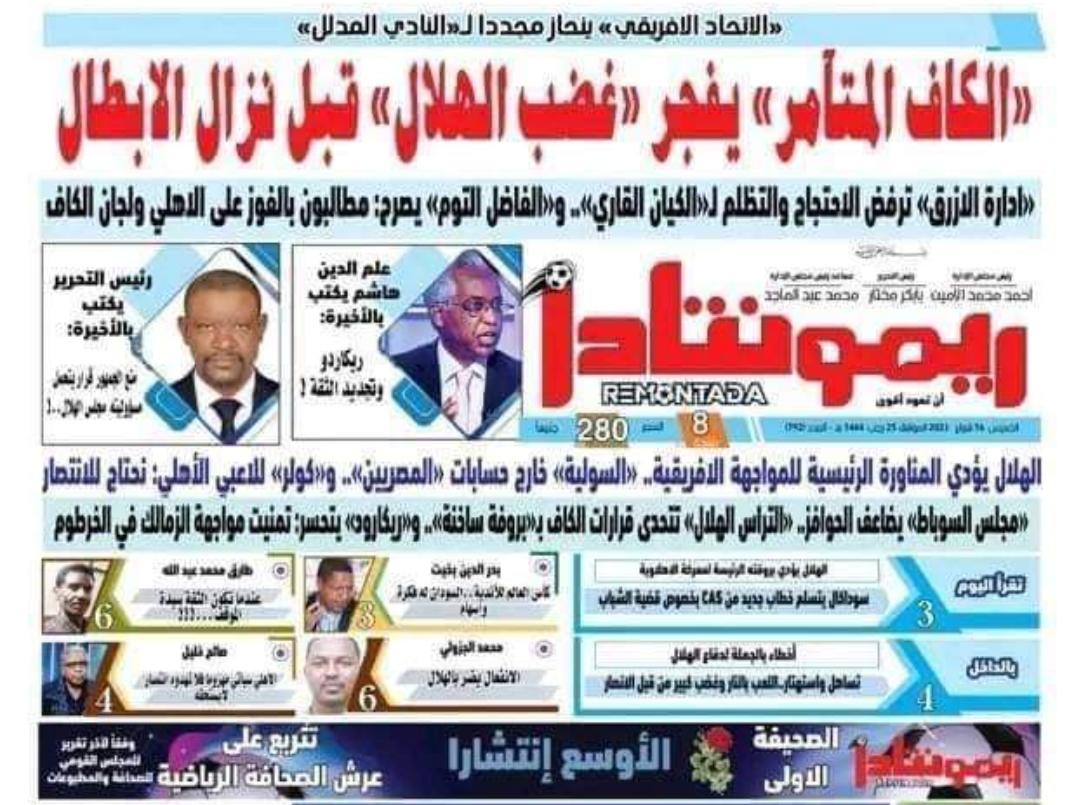 في حين كتبت صحيفة "ريمونتادا"، "الكاف المتآمر يفجر غضب الهلال قبل نزال الأبطال، وادارة الأزرق ترفض الاحتجاج والتظلم بلكيان القاري.. والفاضل التوم يصرح: مطالبون بالفوز علي الأهلي ولجان الكاف".