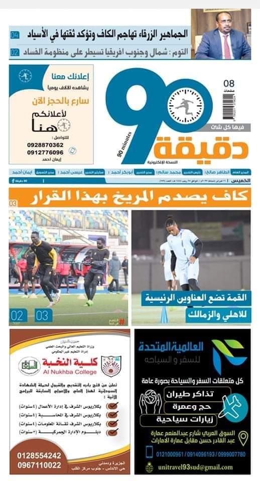 وكتبت صحيفة "90 دقيقة"، ، “الجماهير الزرقاء تهاجم الكاف وتؤكد ثقتها في الأسياد.. الفاضل توم نائب رئيس نادي الهلال السوداني: شمال وجنوب افريقيا تسيطر على منظومة الفساد".
