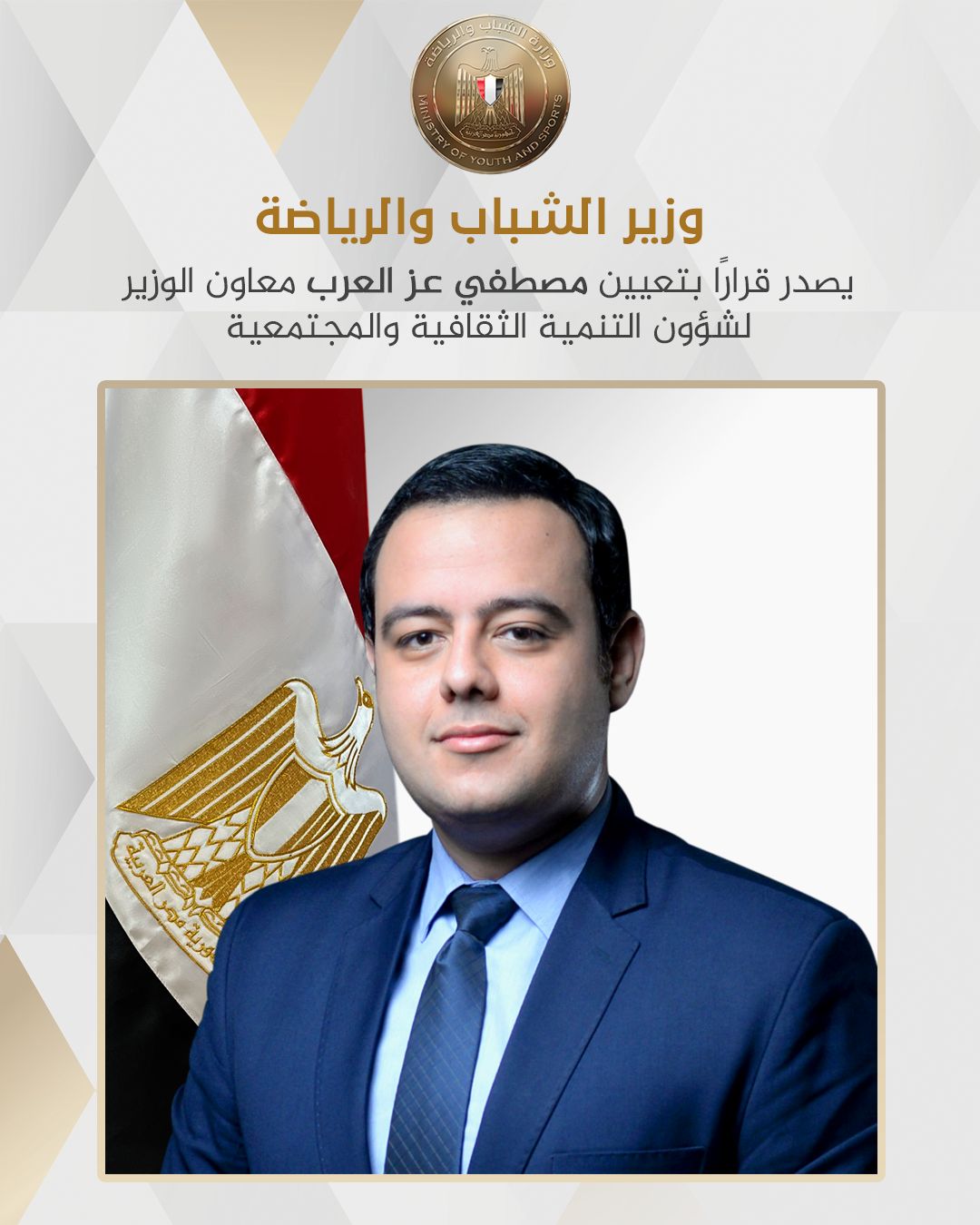 أصدر الدكتور أشرف صبحي وزير الشباب والرياضة قراراً وزارياً بتعيين مصطفي إبراهيم عز العرب معاوناً لوزير الشباب والرياضة لشؤون التنمية الثقافية والمجتمعية.