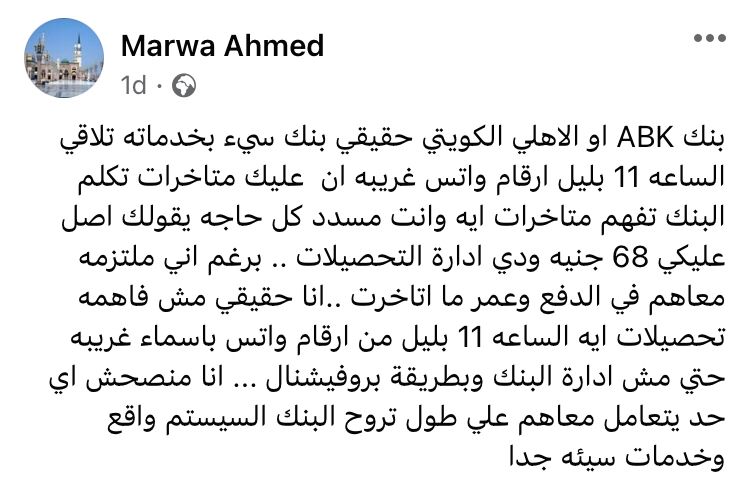 حذر عدد من المواطنين من التعامل مع البنك الأهلي الكويتي ABK، بسبب سوء الخدمات به، حيث قال صاحب شكوي ، "بنك ABK او الاهلي الكويتي حقيقي بنك سيء بخدماته تلاقي الساعه 11 بليل ارقام واتس غريبه ان عليك متاخرات تكلم البنك تفهم متاخرات ايه وانت مسدد كل حاجه يقولك اصل عليكي 68 جنيه ودي ادارة التحصيلات .. برغم اني ملتزمة معاهم في الدفع وعمر ما اتاخرت".
