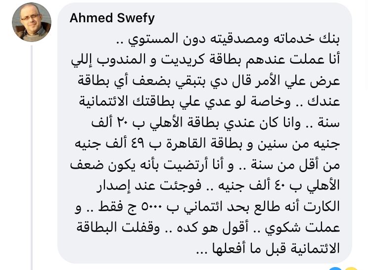 وقال آخر،" بنك خدماته ومصدقيته دون المستوي ..أنا عملت عندهم بطاقة كريديت و المندوب إللي عرض علي الأمر قال دي بتبقي بضعف أي بطاقة عندك .. وخاصة لو عدي علي بطاقتك الائتمانية سنة .. وانا كان عندي بطاقة الأهلي ب 20 ألف جنيه من سنين و بطاقة القاهرة ب 49 ألف جنيه من أقل من سنة .. و أنا أرتضيت بأنه يكون ضعف الأهلي ب 49 ألف جنيه .. فوجئت عند إصدار الكارت أنه طالع بحد ائتماني ب 5000 ج فقط .. و عملت شكوي .. أقول هو كده .. وقفلت البطاقة الائتمانية قبل ما أفعلها ".