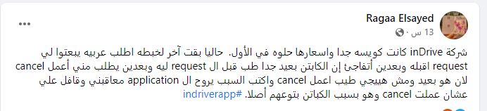 وقالت صاحبة الواقعة،" شركة inDrive كانت كويسه جدا واسعارها حلوه في الأول. حاليا بقت آخر لخبطه اطلب عربيه يبعتوا لي request اقبله وبعدين أتفاجئ إن الكابتن بعيد جدا طب قبل ال request ليه وبعدين يطلب مني أعمل cancel لان هو بعيد ومش هييجي طيب اعمل cancel واكتب السبب يروح ال application معاقبني وقافل علي عشان عملت cancel وهو بسبب الكباتن بتوعهم أصلا".