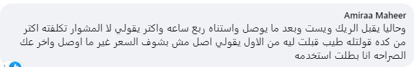وقالت سيدة آخري،" وحاليا يقبل الريك ويست وبعد ما يوصل واستناه ربع ساعه واكتر يقولي لا المشوار تكلفته اكتر من كده قولتله طيب قبلت ليه من الاول يقولي اصل مش بشوف السعر غير ما اوصل واخر عك الصراحه انا بطلت استخدمه".