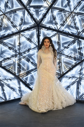 وارتدت أحلام فستان عروس باللون العاجي من تصميم اللبناني نيكولا جبران من مجموعة شتاء وخريف 2023، واستغنت عن الطرحة بالتأكيد، ولكن حرصت أحلام على أن تبطنت الفستان بالكامل.