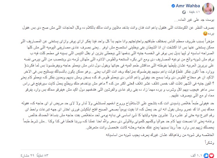 قائلا:" بوست جد على غير العادة.. بصرف النظر عن الكومنتات اللى هتقول يا عم أنت فنان وأنت بتاخد ملايين وأنت مالك بالكلام ده وكل الحاجات اللى مش صح دى بس هقول برده".
