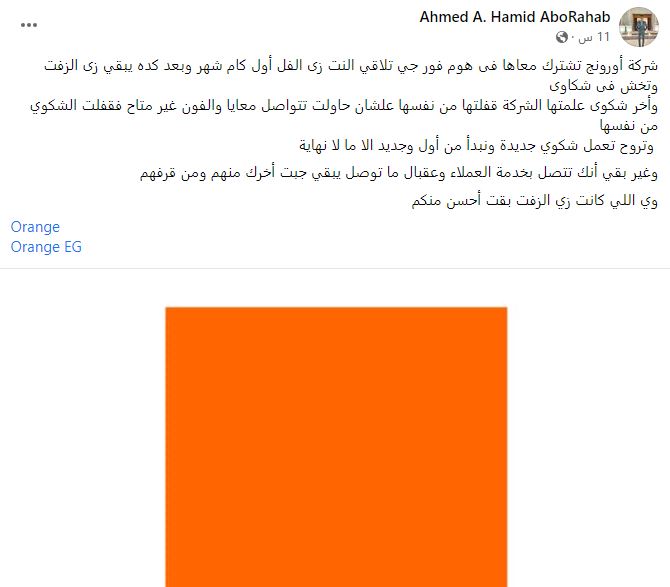 وقال صاحب الشكوي ،" شركة أورونج تشترك معاها فى هوم فور جي تلاقي النت زى الفل أول كام شهر وبعد كده يبقي زى الزفت وتخش فى شكاوى وأخر شكوى علمتها الشركة قفلتها من نفسها علشان حاولت تتواصل معايا والفون غير متاح فقفلت الشكوي من نفسها وتروح تعمل شكوي جديدة ونبدأ من أول وجديد الا ما لا نهاية وغير بقي أنك تتصل بخدمة العملاء وعقبال ما توصل يبقي جبت أخرك منهم ومن قرفهم وي اللي كانت زي الزفت بقت أحسن منكم"