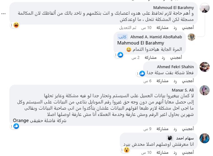 وقال اخر عن شركة أورانج،" لا كمان بيغيروا بيانات العميل على السيستم وتحتار جدا لو فيه مشكلة وعايز تحلها إلى حصل معايا أنهم من دون وجه حق غيروا رقم الموبايل بتاعي من البيانات على السيستم وكل ما اجى احل مشكلة لازم طبعا اقولهم البيانات علشان يتأكدوا من انى صاحبة البيانات وبقالى شهرين بحاول اغير الرقم ومش عارفة وخدمة العملاء أنا مش عارفة اوصلها اصلا شركة فاشلة حقيقي"