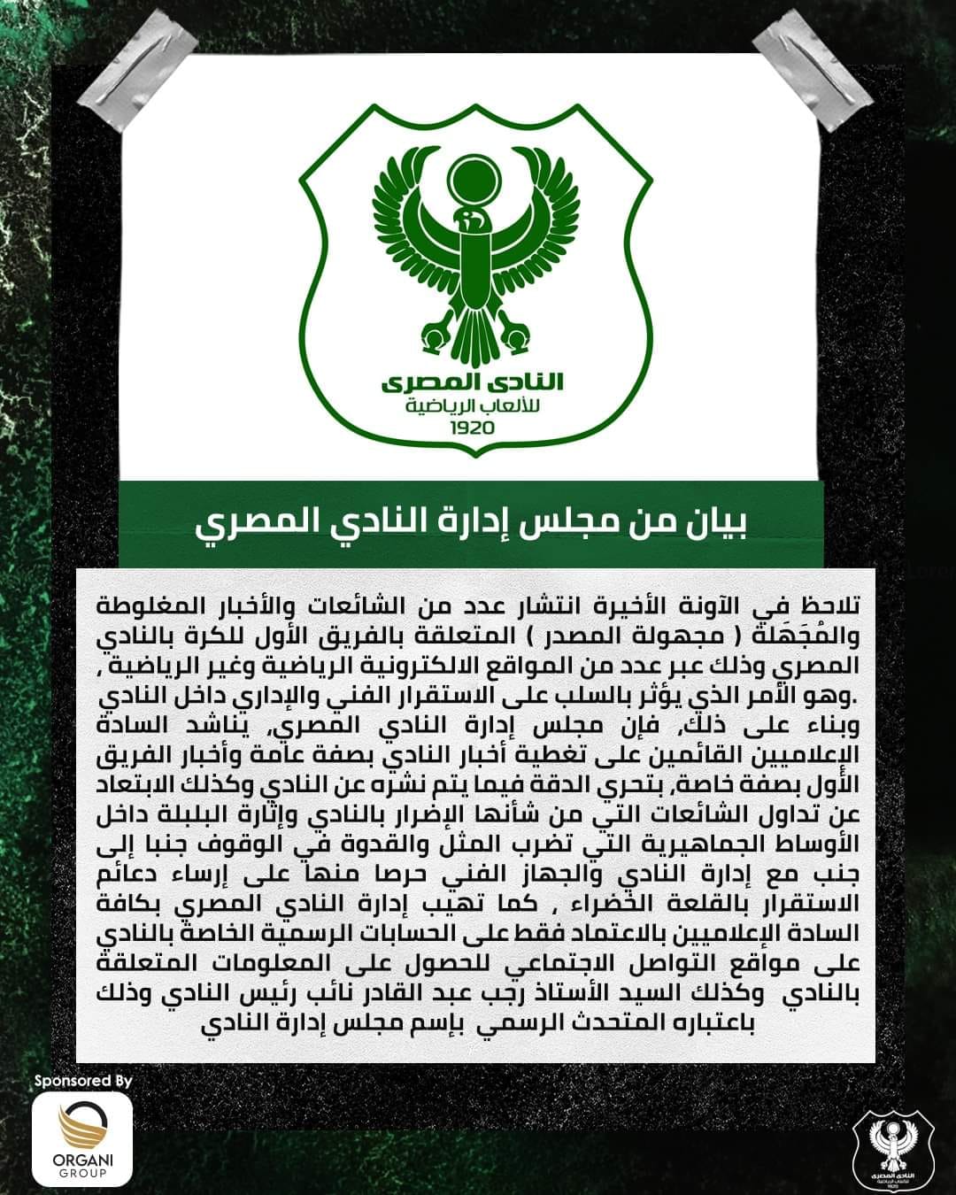وجاء بيان مجلس إدارة المصري للرد على الشائعات، على النحو الآتي: تلاحظ في الآونة الأخيرة انتشار عدد من الشائعات والأخبار المغلوطة والمُجَهَلَة مجهولة المصدر، المتعلقة بالفريق الأول للكرة بالنادي المصري وذلك عبر عدد من المواقع الالكترونية الرياضية وغير الرياضية، وهو الأمر الذي يؤثر بالسلب على الاستقرار الفني والإداري داخل النادي وبناء على ذلك، فإن مجلس إدارة النادي المصري يناشد السادة الإعلاميين القائمين على تغطية أخبار النادي بصفة عامة وأخبار الفريق الأول بصفة خاصة بتحري الدقة فيما يتم نشره عن النادي.