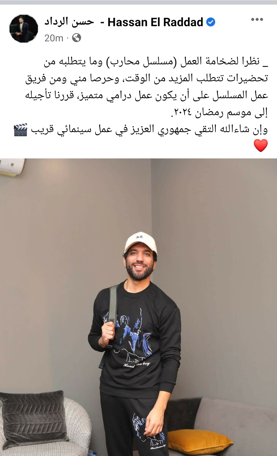 ونشر حسن الرداد عبر صفحته على موقع التواصل الإجتماعي "الفيسبوك" قائلا:" نظرا لضخامة العمل “مسلسل محارب” وما يتطلبه من تحضيرات تتطلب المزيد من الوقت، وحرصا مني ومن فريق عمل المسلسل على أن يكون عمل درامي متميز، قررنا تأجيله إلى موسم رمضان 2024".