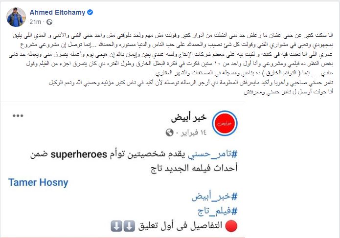 وكتب أحمد التهامى، قائلًا : "أنا سكت كتير عن حقي عشان ما زعلش حد مني أتشلت من أدوار كتير وقولت مش مهم ولحد دلوقتي مش واخد حقي الفني والأدبي و المدي اللي يليق بمجهودي وتعبي في مشواري الفني وقولت كل شئ نصيب والحمدلله على حب الناس والدنيا مستوره والحمدلله".