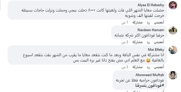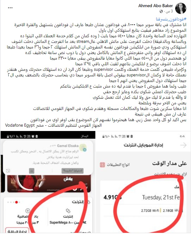 وتابع صاحب الواقعة "لو هنخصم دول من الـ 5400 ميجا اللي كانوا معايا فالمفروض يبقى معايا 3300 ميجا انا دخلت اشوف برضو ع ابلكيشن بتاعهم لقيت اللي باقي 1294 ميجا وكإجراء طبيعي كلمت خدمة العملاء وكلمت supervisor وطبعا كان الرد ان ده استهلاك حضرتك ومش هنقدر نعملك حاجة لا وكمان الsupervisor بيقولي اصل باقة السوبر ميجا دي بتحاسب حضرتك بالضعف يعني ال2 جيجا استهلاك دول المفروض يعني انهم 4 جيجا طيب ولما هما مفروض 4 جيجا يا فندم ليه ده مش مثبت ع الابلكيشن بتاعكم طيب حضرتك اعملي شكوى بكده وعايز ارجع حقي لا والله يا فندم لا ليك حق ولا ليك كمان انك تعمل شكوى يعني من الاخر سرقة وبلطجة انا معايا سكرين شوت طبعا والمكالمات مسجلة وهقدم شكوى في الجهاز القومي للاتصالات.. عارف ان مش هيبقى في نتيجة .. بس اكيد لو كل واحد عمل زيي هما هيحترموا نفسهم لان الموضوع بقى اوفر اوي من فودافون"