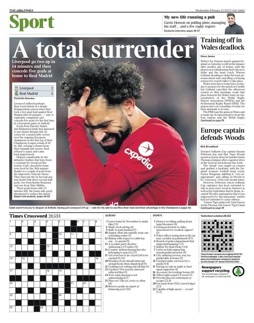 فيما وصفت "صحيفة تايمز"، سقوط ليفربول أمام ريال مدريد بـ"استسلام تام"، وقالت "ليفربول يسجل هدفين بأول 14 دقيقة فقط ليتلقى 5 أهداف على ملعبه من ريال مدريد" ، ثم "أضافت ليفربول يتعرض لأقل هزيمة تاريخية على ملعبه بالمسابقات الأوروبية"، وتحدثت عن حال محمد صلاح في المباراة وكتبت "صلاح من الفرحة لليأس بعد خسارة فريقه التقدم والنتيجة في مباراة الذهاب"