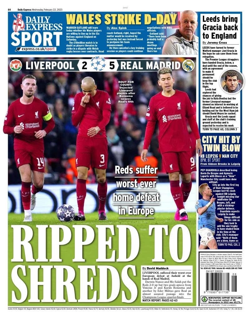 إلى جانب صحيفة "ديلي إكسبرس" التي عنونت "ليفربول يتمزق لأشلاء على يد مدريد"، ووصفت الحدث قائلة "الريدز يتكبّد أسوء هزيمة اوروبية بتاريخه على ملعبه"، وعن ما قدمه المرينجي في المباراة ذكرت "هدفين من فينيسيوس وبنزيما وهدف ميليتاو بمنحون مدريد طريقًا شبه محسوم لربع النهائي"