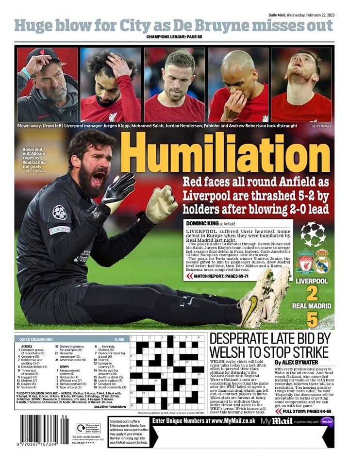 وجائت صحيفة "ديلي ميل" لتعرب عن ما حدث بـ "إهانة"، ووصفت شعور لاعبي الريدز كلأتي "وجوه لاعبي ليفربول عليها الاحراج ويبدون مضطربين بعد السحق من بطل المسابقة ريال مدريد 5-2"، ووصفت المباراة " ليفربول تعرض لأكبر هزيمة أوروبية بتاريخه على ملعب آنفيلد"، الى جانب "ليفربول يتعرض للإهانة من ريال مدريد".
