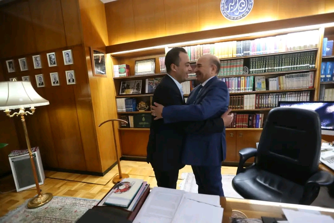 واستقبله الكابت عبد المحسن سلامة رئيس مجلس إدارة مؤسسة الأهرام، والكاتب الصحفى علاء ثابت رئيس تحرير الأهرام، والكاتب الصحفى ماجد منير رئيس تحرير بوابة الأهرام والأهرام المسائى، والكاتب الصحفى حسين الزناتى رئيس تحرير مجلة علاء الدين، والكاتب الصحفى عزت إبراهيم رئيس تحرير الأهرام ويكلى، والكاتب الصحفى أحمد ناجى قمحة رئيس تحرير مجلة السياسة الدولية، والكاتب الصحفى خالد داود، والكاتب الصحفى على الجمال مدير تحرير الأهرام المسائى، والكاتب الصحفى ياسين غلاب نائب رئيس تحرير الأهرام المسائى، والكاتب الصحفى طارق السنوطى نائب رئيس تحرير جريدة الأهرام، والكاتب الصحفى إسماعيل العوامى، مدير تحرير جريدة الأهرام.