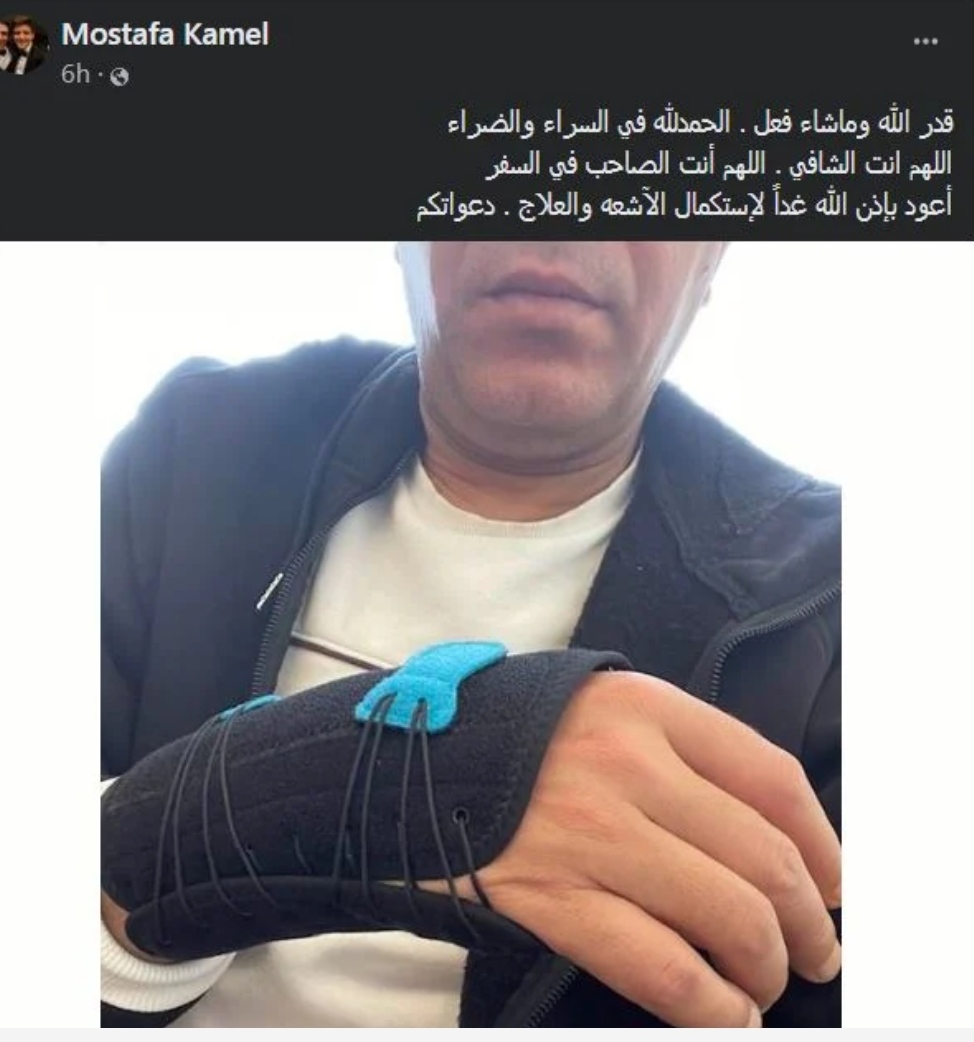 ونشر مصطفى كامل عبر صفحته على موقع التواصل الإجتماعي"الفيسبوك"صورة له وهو يرتدي معصما طبيا على يديه.