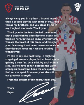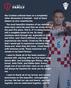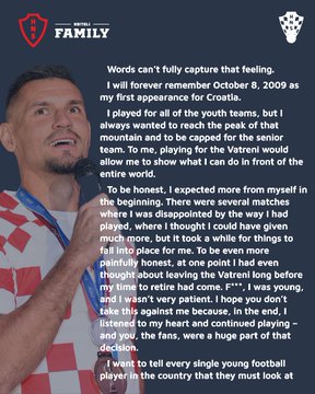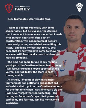 وتابع :"حان الوقت بالنسبة لي لأقول وداعي الأخير للمنتخب الكرواتي ، رغم أنني سأظل دائمًا داعمًا كبيرًا للمنتخب وسأتبع الفريق في كل مباراة قادمة ، عندما كنت طفلًا ، كنت أحلم باللعب في البطولات الكبرى وأن أرتدي هذا القميص الأحمر والأبيض. ارتديت لعبة الداما الكرواتية لأول مرة عندما كنت في التاسعة من عمري ولن أنسى أبدًا هذا الشعور الخاص – مثل ارتداء رداء سوبرمان، شعرت بالقوة والثقة والشجاعة ، تمامًا مثل بطلي المفضل، لا تستطيع الكلمات أن تعبر عن هذا الشعور بالكامل".
