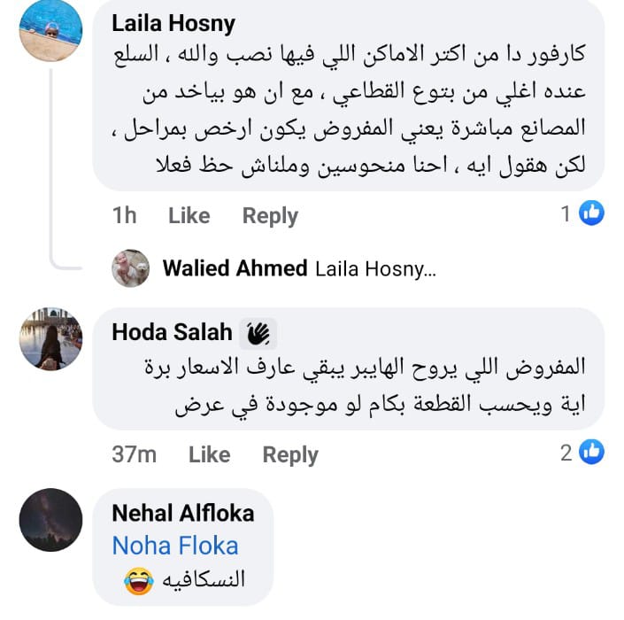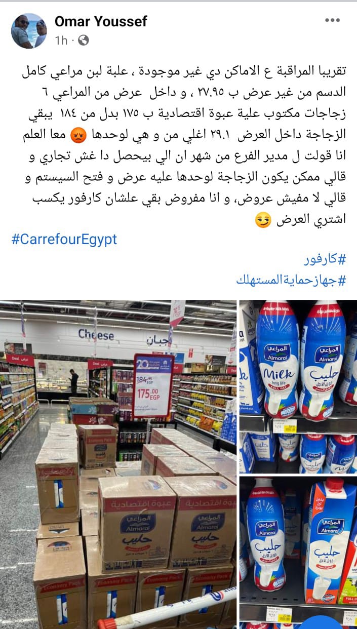 وقال ،"تقريبا المراقبة ع الاماكن دي غير موجودة ، علبة لبن مراعي كامل الدسم من غير عرض ب 27.95 ، و داخل عرض من المراعي 6 زجاجات مكتوب علية عبوة اقتصادية ب 178 بدل من 184 يبقي الزجاجة داخل العرض 29.1 اغلي من و هي لوحدها معا العلم انا قولت لمدير الفرع من شهر ان الي بيحصل دا غش تجاري و قالي ممكن يكون الزجاجة لوحدها عليه عرض و فتح السيستم و قالي لا مفيش عروض، و انا مفروض بقي علشان كارفور يكسب اشتري العرض".