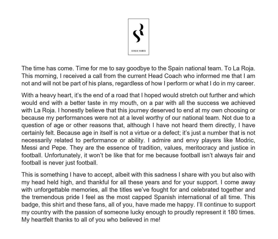 ونشر سيرجيو راموس عبر صفحته الرسمية على موقع التواصل الإجتماعي"فيس بوك" : "لقد حان الوقت، حان الوقت لنقول وداعًا للمنتخب الوطني، حبيبنا الأحمر المثير. تلقيت هذا الصباح مكالمة من المدرب الحالي الذي أخبرني أنه لا يحسبني وأنه لن يعتمد علي، بغض النظر عن المستوى الذي يمكنني إظهاره أو كيف أواصل مسيرتي الرياضية".