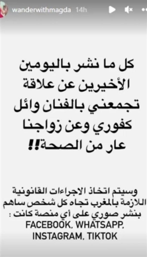 ومن خلال خاصية القصص القصيرة عبر حسابها في موقع إنستجرام، كتبت ماجدة أليموس: "كل ما نشر باليومين الأخيرين عن علاقة تجمعني بالفنان وائل كفوري وعن زواجنا عار من الصحة".