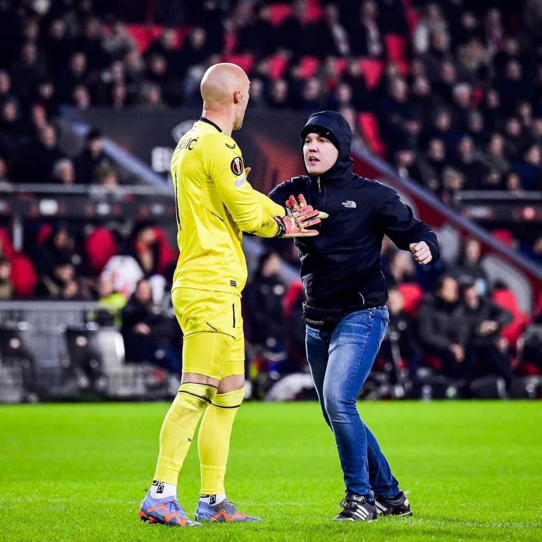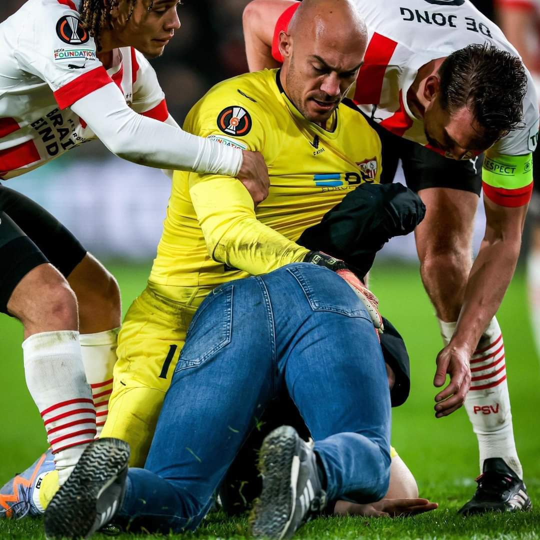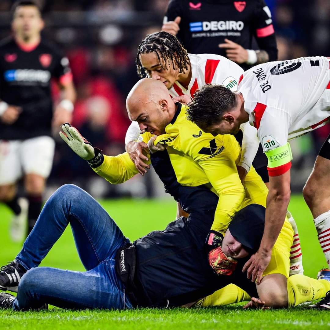 أقتحم أحد جماهير فريق أيندهوفن مباراة فريقه اليوم أمام إشبيلية وحاول التعدي على ديمتروفيتش حارس مرمى الفريق الإسباني في الدقائق الأخيرة من عمر المباراة.