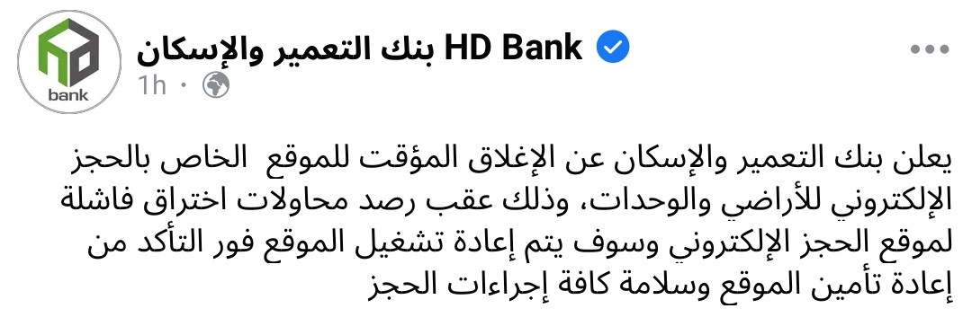 أعلن بنك التعمير والإسكان الإغلاق المؤقت للموقع الخاص بالحجز الإلكتروني للأراضي والوحدات.