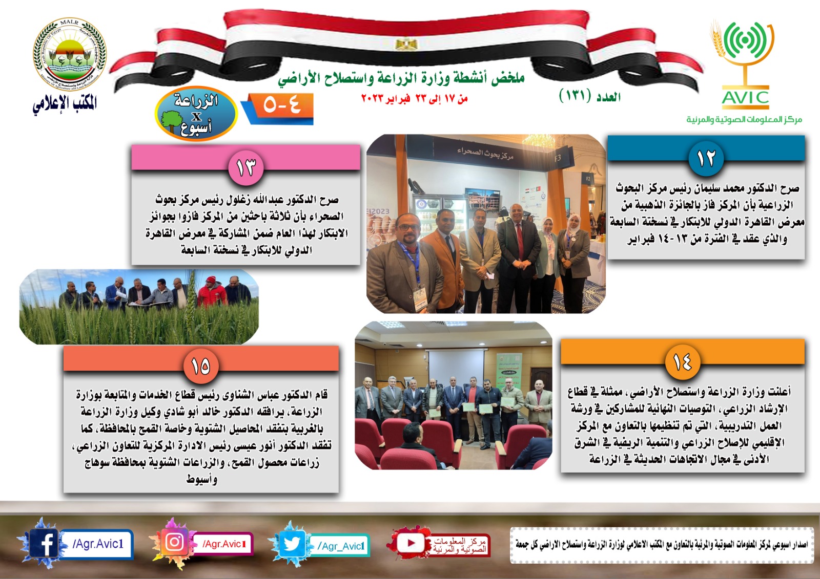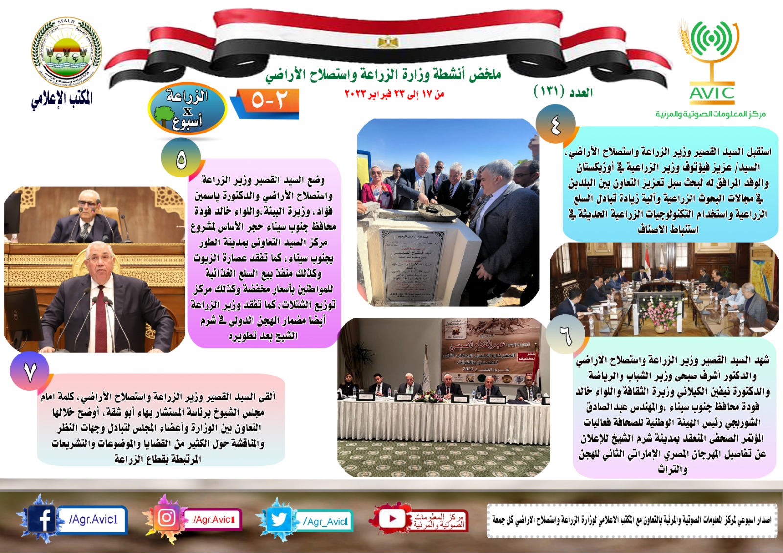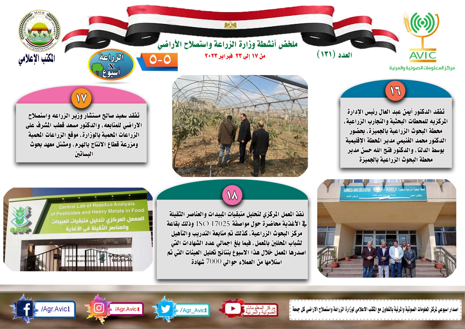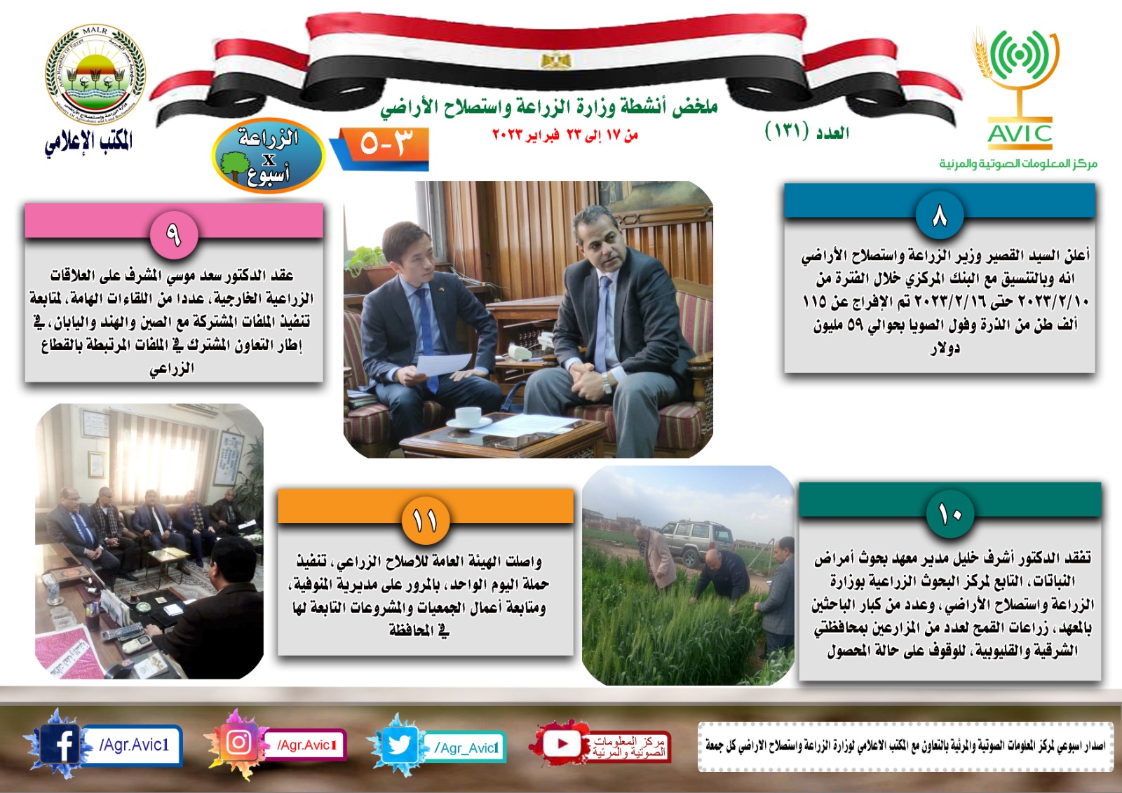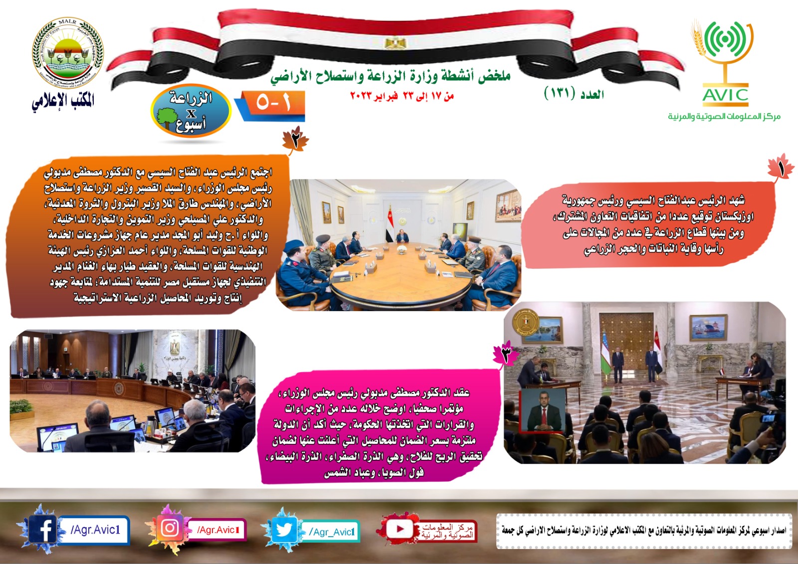 أصدر مركز المعلومات الصوتية والمرئية، التابع لوزارة الزراعة واستصلاح الاراضي، "الانفوجراف الاسبوعي" في نسخته رقم 131 ، حول الحصاد الاسبوعي لأهم أنشطة الوزارة، خلال الاسبوع الماضي في الفترة من 17 وحتى 23 فبراير الجاري، وذلك بالتعاون مع المكتب الاعلامي للوزارة، كما أصدر المركز ايضا ملخصا بالفيديو، حول انشطة الوزارة خلال نفس الفترة.