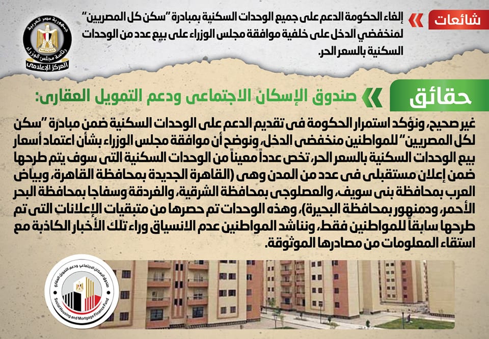 قام المركز الإعلامي لمجلس الوزراء بالتواصل مع صندوق الإسكان الاجتماعي ودعم التمويل العقاري، والذي نفي تلك الأنباء، مُؤكداً أنه لا صحة لإلغاء الحكومة الدعم على جميع الوحدات السكنية بمبادرة "سكن كل المصريين" لمنخفضي الدخل على خلفية موافقة مجلس الوزراء على بيع عدد من الوحدات السكنية بالسعر الحر.
