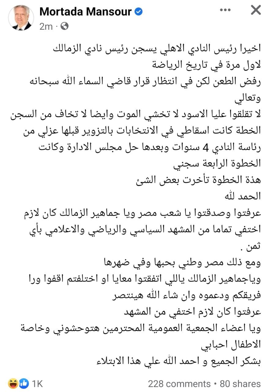 وأضاف : "عرفتوا وصدقتوا يا شعب مصر ويا جماهير الزمالك كان لازم اختفي تماما من المشهد السياسي والرياضي والاعلامي بأي ثمن ، ومع ذلك مصر وطني بحبها وفي ضهرها ، وياجماهير الزمالك ياللي اتفقتوا معايا او اختلفتم اقفوا ورا فريقكم ودعموه وان شاء الله هينتصر ، عرفتوا كان لازم اختفي من المشهد".