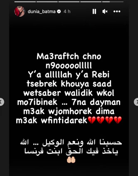 واستخدمت دنيا بطمة، خاصية "الاستورى" وكتبت قائلة :"معرفش شنو نقول يا الله يا ربي تصبرك اخويا سعد، وتصبر والديك وكل محبينك، احنا دايما معك وجمهورك دايما معك وفي انتظارك"، وأختتمت دنيا بطمة، قائلة :" حسبنا الله ونعم الوكيل.. الله ياخذ فيك الحق ابنة فرنسا".