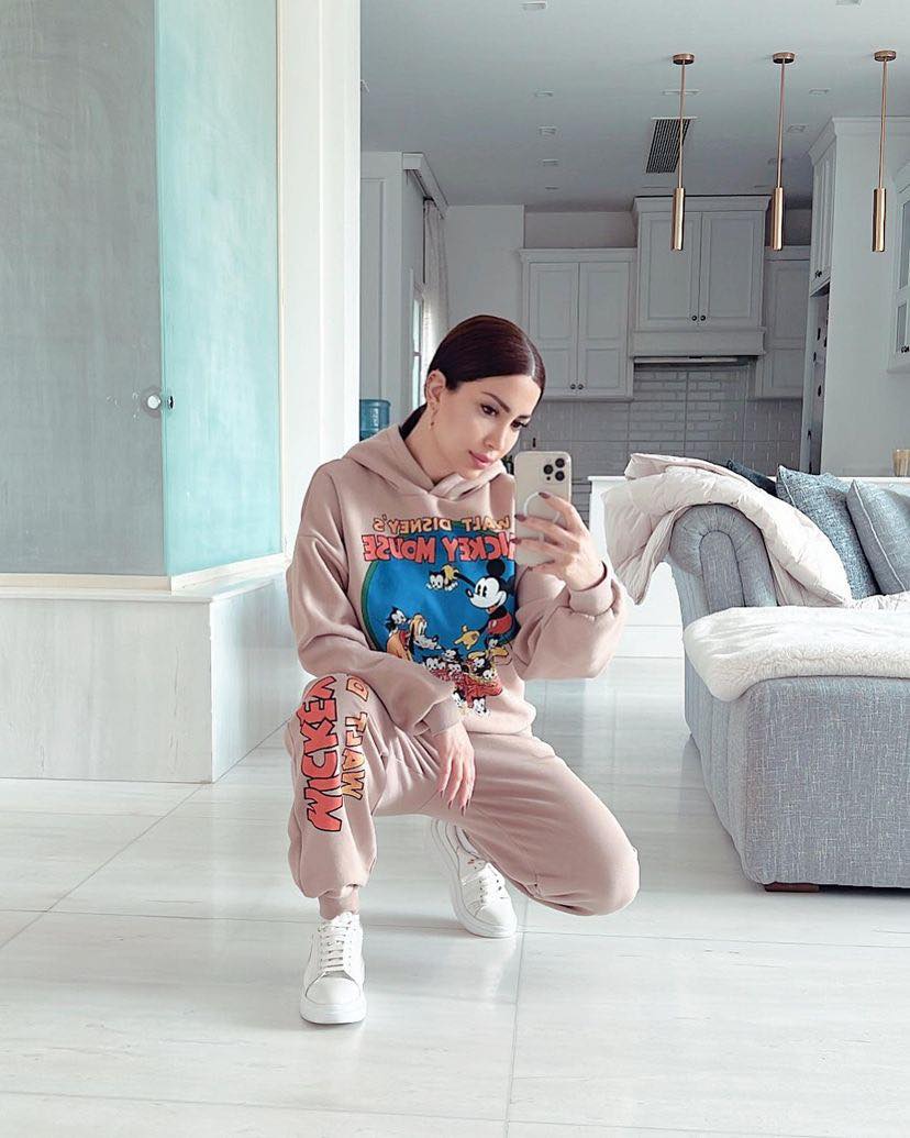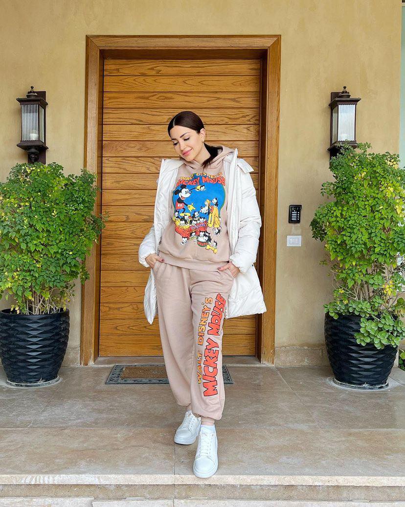 وظهرت نسرين طافش بتوب من اللون البيج وعليه صور الكارتون، ومعه بنطلون بنفس اللون، وقامت بجمع شعرها.