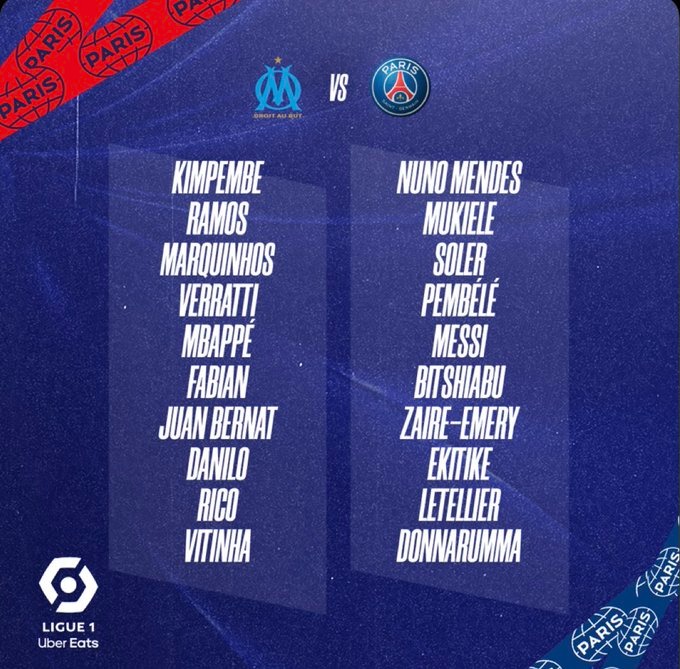 وشهدت قائمة باريس سان جيرمان لمواجهة مارسيليا غياب كل من، أشرف حكيمي ونيمار دا سيلفا ونونو مينديز بالإضافة إلى ريناتو سانشيز.