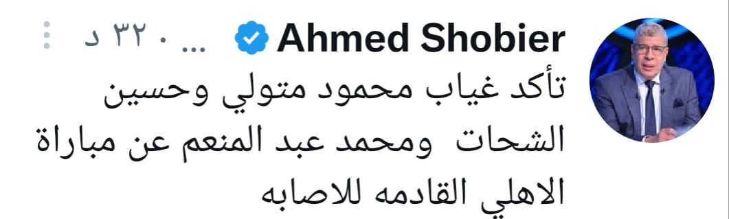 ونشر أحمد شوبير علي صفحته الرسمية علي موقع التواصل الإجتماعي "تويتر": "تأكد غياب محمود متولي وحسين الشحات ومحمد عبد المنعم عن مباراة الاهلي القادمه للاصابة".