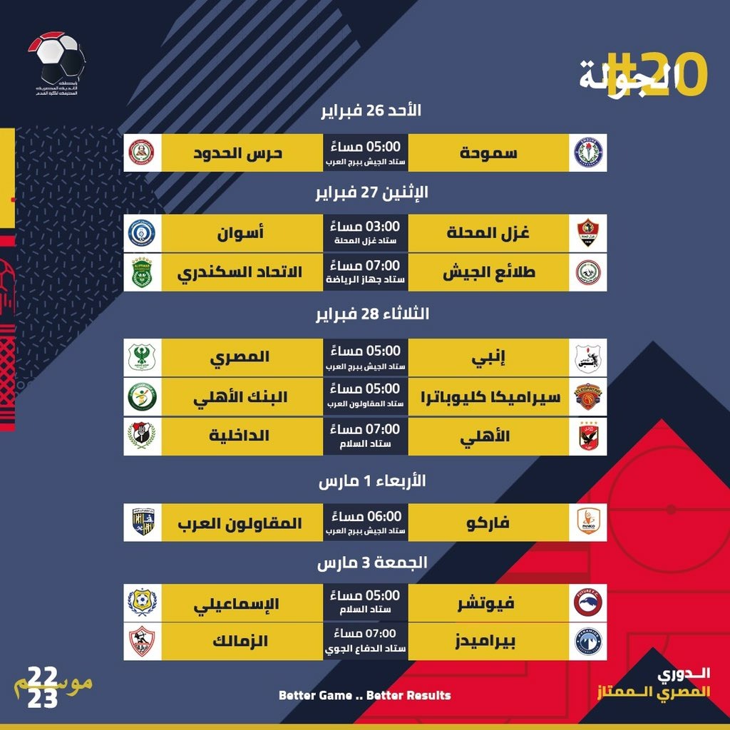 بالأضافة إلى يوم الابعاء الموافق 1 من مارس، يلتقي فاركو مع المقاولون العرب، في الساعة السادسة مساءً، علي استاد الجيش ببرج العرب.