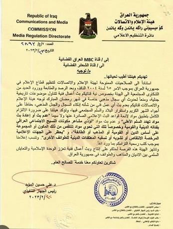 وبعد الرصد والمتابعة وورود العديد من الشكاوي المجتمعية إلى الهيئة بخصوص نية قناتكم بث أعمال فنية تتناول موضوعات تاريخية جدلية، ومنعا لحدوث أي سجال مذهبي خاصة في شهر رمضان المبارك توجه هيئة الإعلام والاتصالات قناتكم بعدم بث أي عمل فني من شأنه إذكاء السجال والجدل المذهبي حفاظا على أجواء الشهر الكريم واستقرار البلاد والسلم المجتمعي.