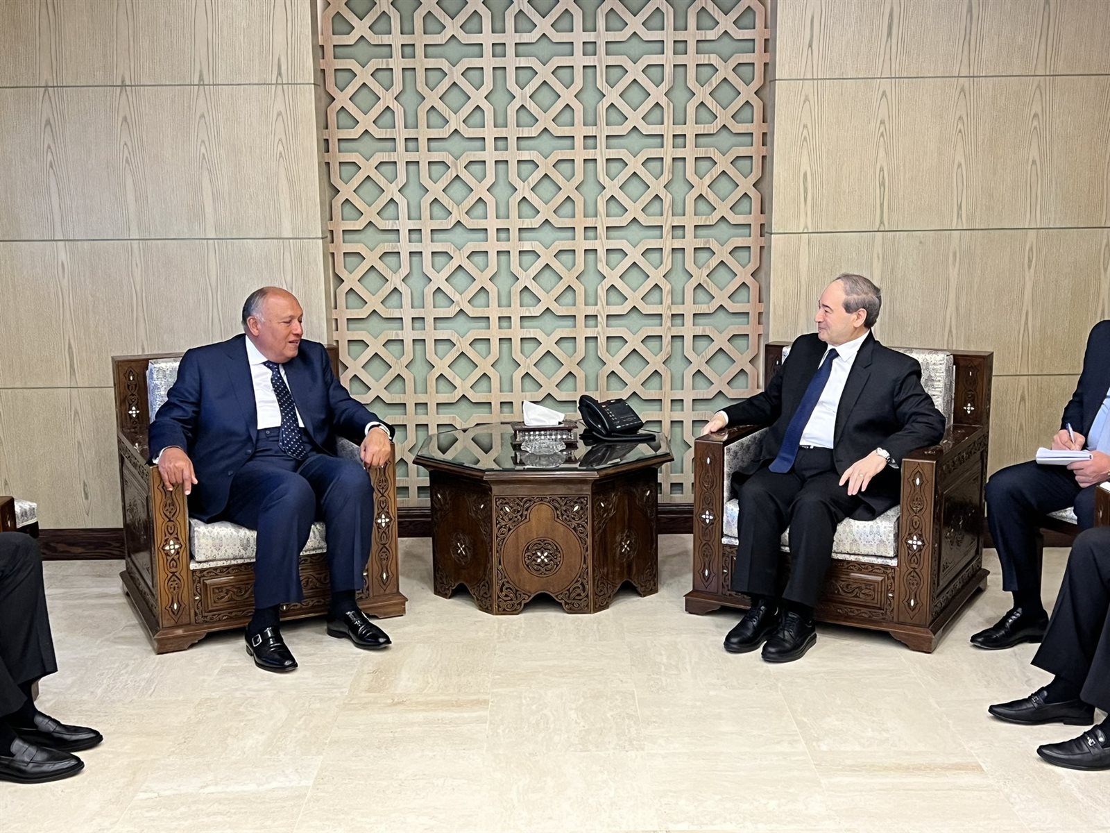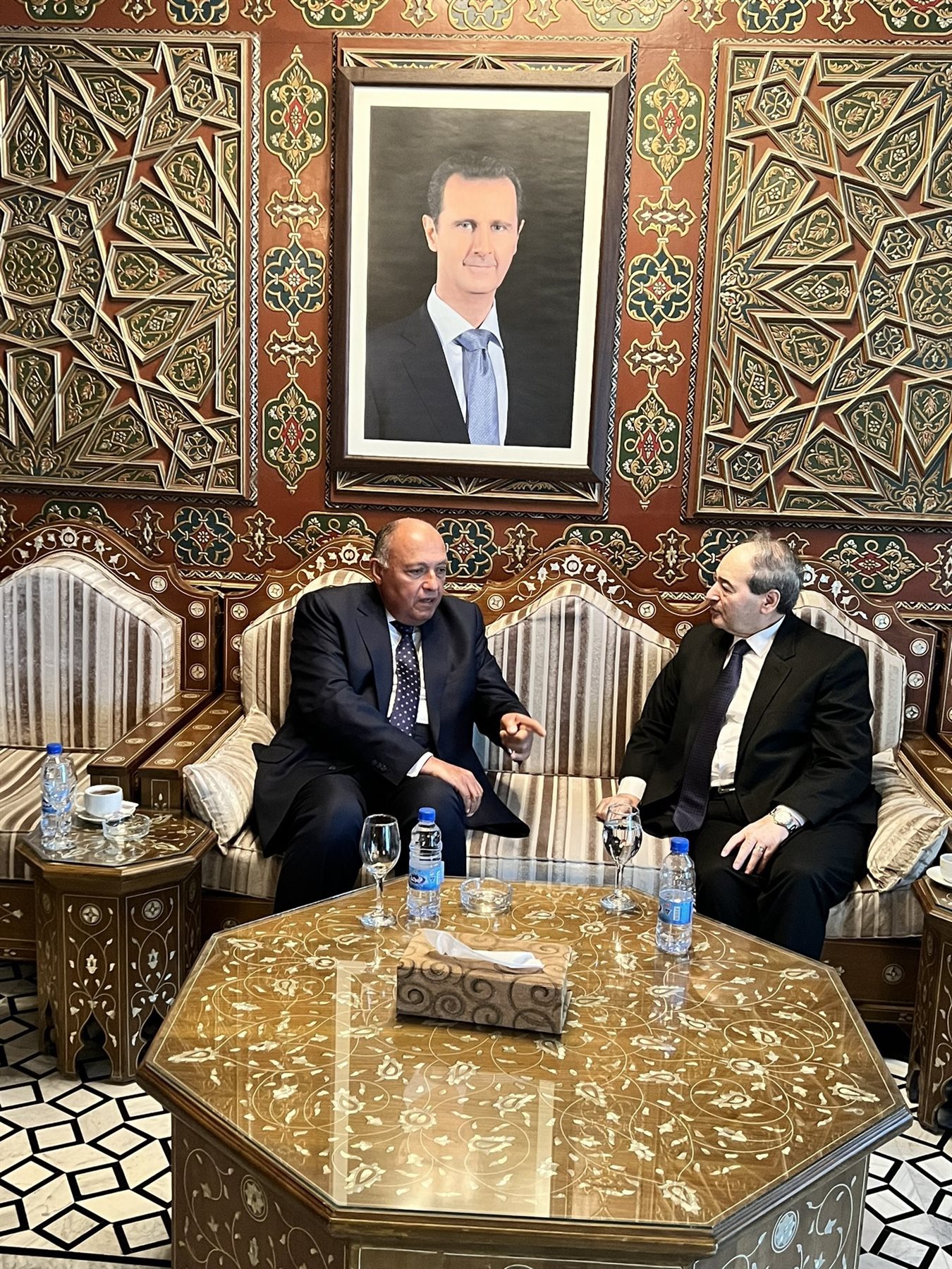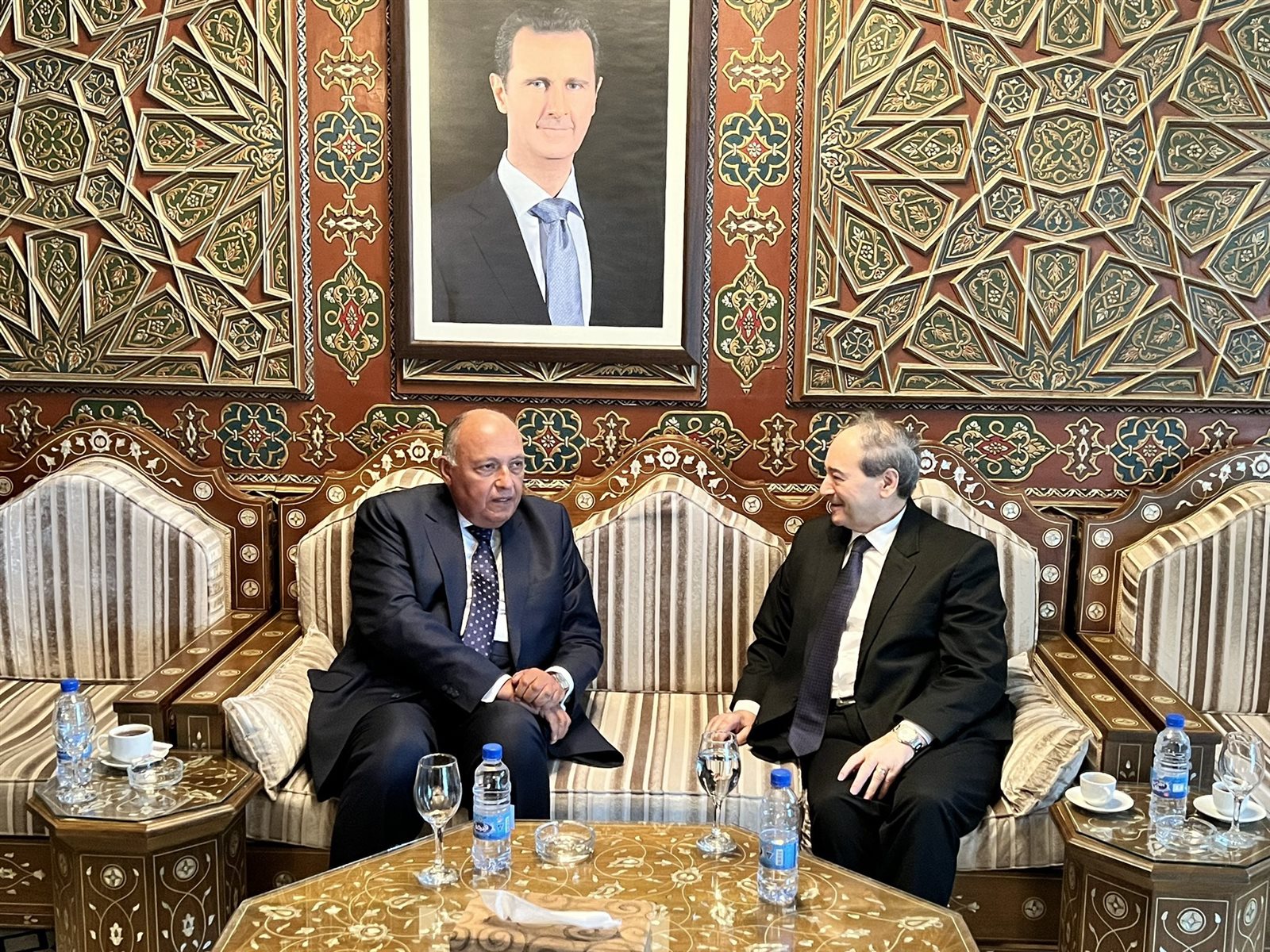 ونشر المتحدث الرسمي باسم وزارة الخارجية السفير أحمد أبو زيد صور وصول الوزير شكري إلى دمشق، مؤكدا أن الدكتور فيصل المقداد وزير خارجية سوريا كان في استقباله، لافتا لعقد الجانبين جلسة مباحثات ثنائية.