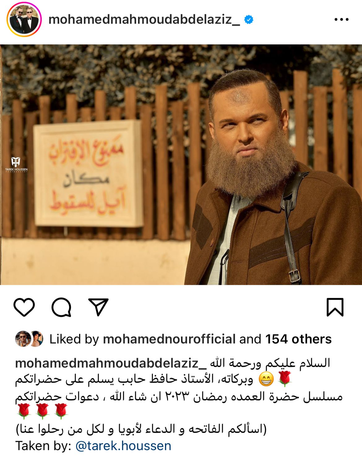 معلقًا عليها : " السلام عليكم ورحمة الله وبركاته، الأستاذ حافظ حابب يسلم على حضراتكم مسلسل حضرة العمدة رمضان 2023 ان شاء الله، دعوات حضراتكم".