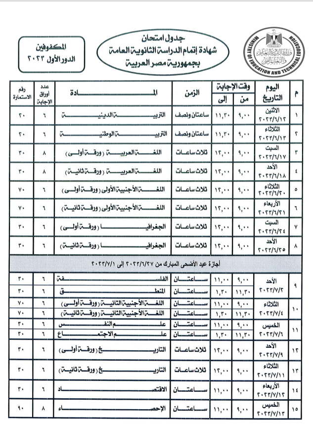 ومن المقرر أن تبدأ الامتحانات يوم الإثنين الموافق 2023/6/12 وتستمر حتى السبت الموافق 2023/7/15.