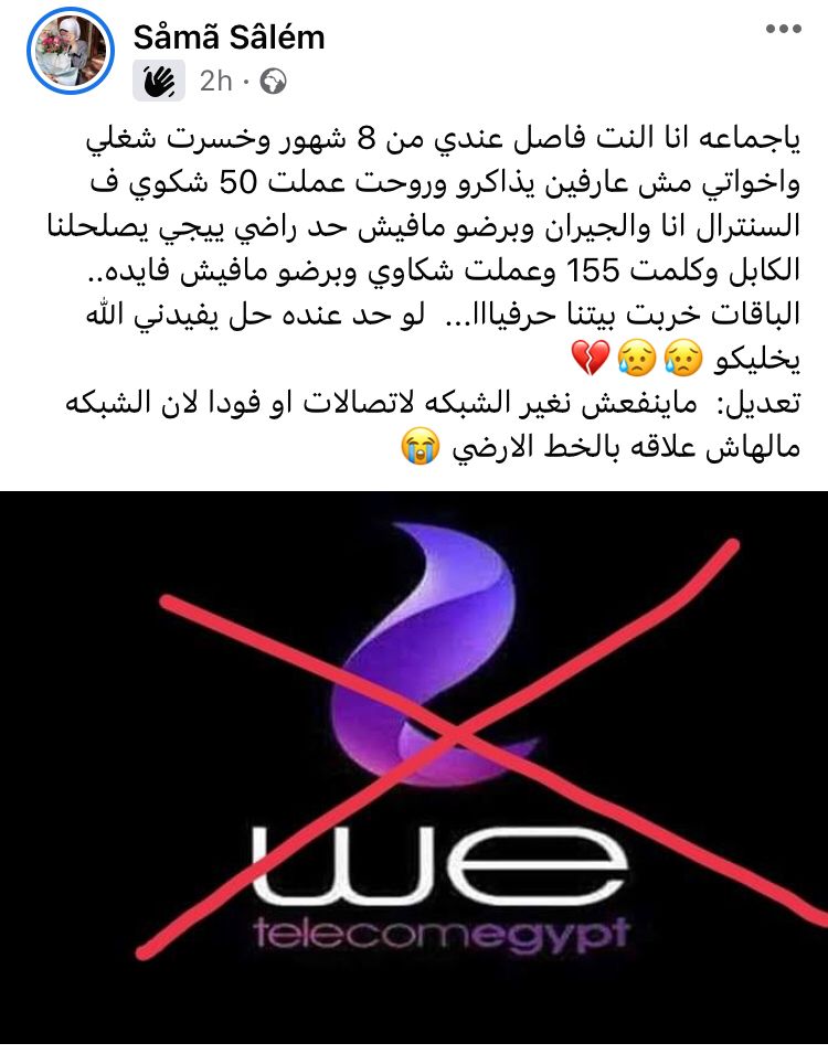وقالت صاحبة الواقعة عن مشكلتها مع wec،" ياجماعة انا النت فاصل عندي من 8 شهور وخسرت شغلي واخواتي مش عارفين يذاكرو وروحت عملت 50 شكوي ف السنترال انا والجيران وبرضو مافيش حد راضي ييجي يصلحلنا الكابل وكلمت 155 وعملت شكاوي وبرضو مافيش فايدة.